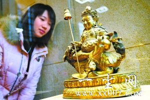 16世纪铜鎏金多闻天王像。北京日报记者 方非摄
