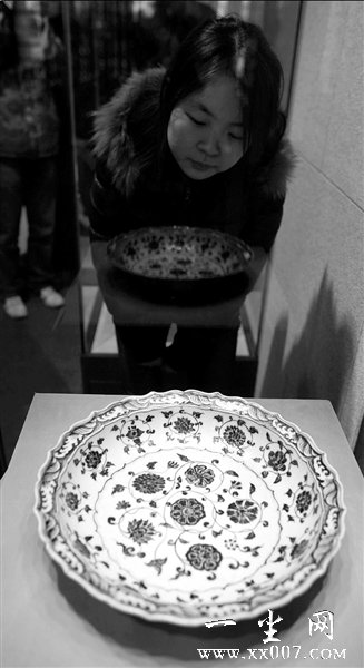明宣德年间的青花缠枝莲纹菱花口盘。摄影记者周民