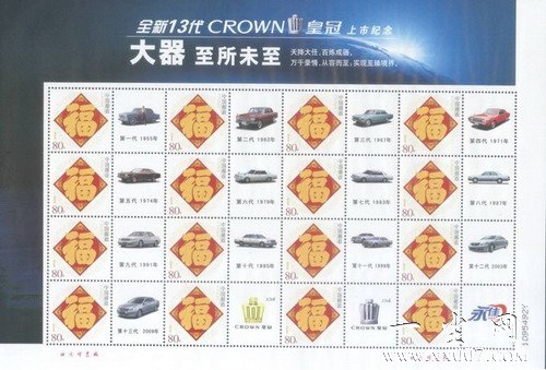 值此之际永佳丰田携手中国邮政,把将皇冠的历代车型制作成邮票,这套邮票记载了每一代皇冠的变迁和永佳丰田的荣耀。邮票上由中国传统“福”字、历代皇冠车型、第12代、13代皇冠LOGO、永佳丰田LOGO组成,由北京邮票厂印刷,全国共发行500套,每套邮票上都有唯一的编码,极具收藏价值!