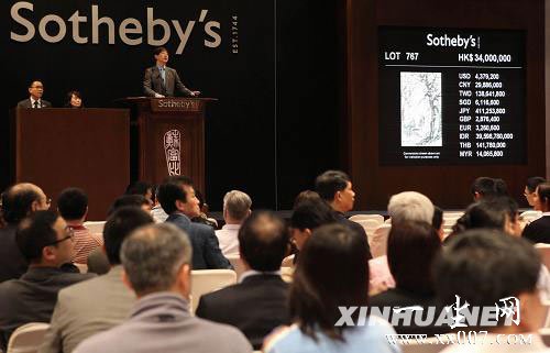 当日,香港苏富比2010年春季拍卖会中国书画场在香港会展中心举行。傅抱石的《对奕图》以3874万港元成交,为估价的五倍。新华社记者黄晓勇摄