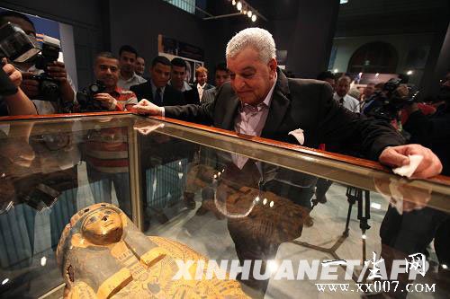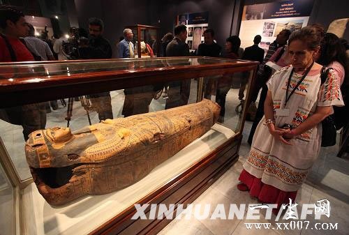 4月7日,埃及最高文物委员会秘书长哈瓦斯在开罗的埃及博物馆参观距今约4000年前的经过修复的法老石棺。