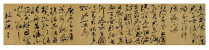 这卷《祝允明自书诗》(图为局部)现藏上海博物馆,纵47.9厘米,横1178.5厘米。卷首钤“大原”白文起首印,卷末钤“祝允明印”白文印、“希哲”朱文印。此作为其晚年作品,该卷风骨烂漫,气势奔放,才情横溢,于张旭、怀素的癫狂醉态中兼有黄庭坚的舒展矫健、米元章的跌宕疏放,苏东坡的浑厚丰腴,李北海的秀逸沉雄,狂而不乱,情浓势足,激跃奔发,气度不凡。其书法线条如“百尺钢化绕指柔”,犹若钢丝弹簧,使转如意,筋道不绝。他的每根线条都极富弹劲和韧性,都能立于纸素之上,这种行笔过程中的饱满度和立体感完全突破了明初以来扁平无力的“馆阁体”书风对书坛的笼罩,一扫靡靡之格。祝允明能于矩绳约度中而具豪纵奔逸的意气,应该说是开创了前所未有的书法新风。
