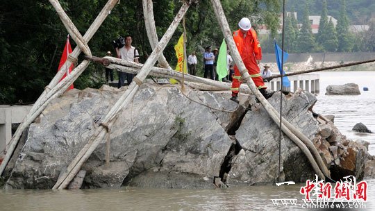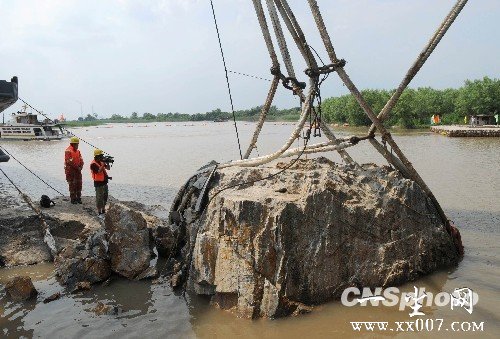 6月4日,江苏镇江市,原定当日下午1时许进行的第一块疑为《瘗鹤铭》残碑巨石的打捞,由于巨石发生碎裂,致使打捞工作暂停。打捞人员表示,针对出现的新情况,将尽快制定新的打捞方案,完成打捞工作。据了解,由于镇江市正在对焦山水域的闸道进行改造,今后大型打捞船只将难以进入,此次寻找《瘗鹤铭》残碑被认为是“最后一次努力”。 中新社发 陈岗 摄