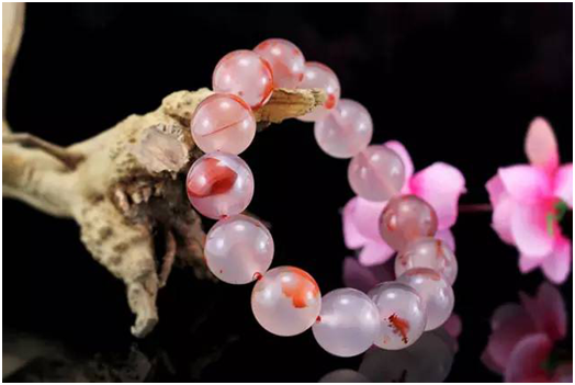 樱桃红料子偏水一些,对光可见红色透光。这种珠子在市面上比较多,价格也比较低,颜色偏粉,半透明,看上去水盈盈的,很受女孩子喜欢。