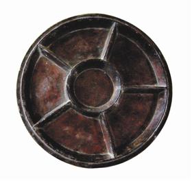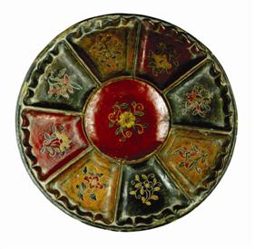 也是天定奇缘,果盒前脚刚到,又有人寻到“千年一品收藏会所”鉴定一件古旧之物,竟然是一只百年果盘!果盘直径45厘米,为整块细木雕琢而成,古朴而大气。盘心分八格(图4),分别彩绘红、黄、黑地朵花,凭添了许多清雅素丽。