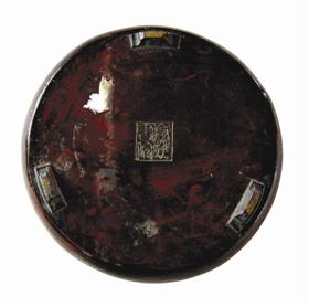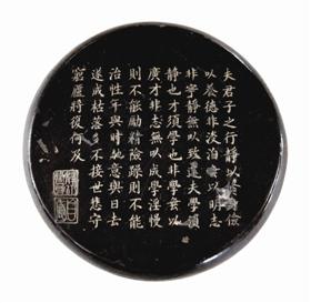 这是个圆形的黑漆盒子,髹的是国漆,润泽莹亮。盒子直径26、高仅6.5厘米,盒心六格(图1),朴实无华。盒面书有金字,为诸葛孔明的《诫子书》(图2),全文为“夫君子之行,静以修身,俭以养德。非淡泊无以明志,非宁静无以致远。夫学须静也,才须学也。非学无以广才,非志无以成学。淫慢则不能励精,险躁则不能治性。年与时驰,意与日去,遂成枯落。多不接世,悲守穷庐,将复何及”。书为颜楷,架构严整,书风庄重。落款“自庵”,钤闲章“静以修身”。盒底有篆印“岳麓书院”(图3),刀笔方正。