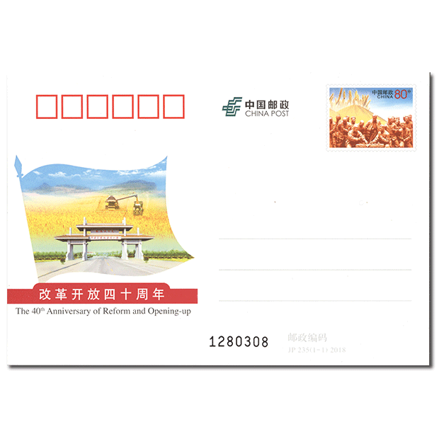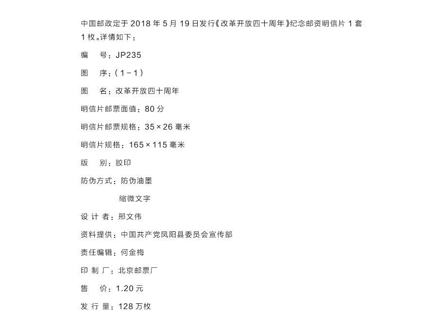 5月19日发行《改革开放四十周年》纪念邮资片1套1枚