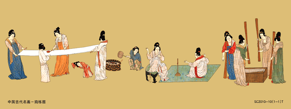 《捣练图》,唐代画家张萱所绘。工笔重彩,亦系宋徵宗摹本,现藏美国波士顿美术博物馆。《捣练图》描绘了从捣练到熨练各种活动中的妇女们的情态,刻画了不同人物的仪容与性格。表现的是妇女捣练缝衣的场面,人物间的相互关系生动而自然。从事同一活动的人,由於身份、年龄、分工的不同,动作、表情各各不一,并且分别体现了人物的特点。人物形象逼真,刻画维肖,流畅,设色艳而不俗,反映出盛唐崇尚健康丰腴的审美情趣,代表了那个时代人物造型的典型时代风格。