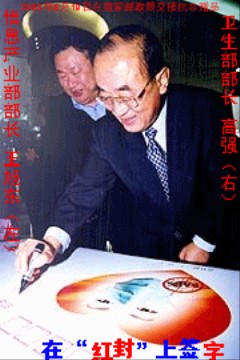 图片人物: 卫生部部长 高强(右),信息产业部部长 王旭东(左)并同时在 “红封”上题词