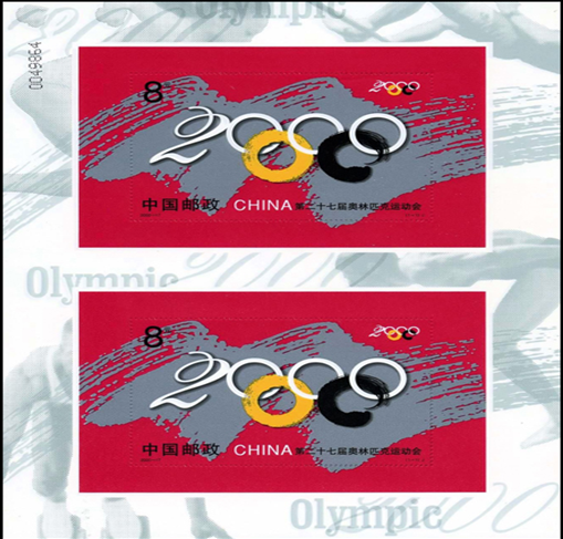 2000年10月31日,为配合国际邮票钱币博览会在广州市举行,我国邮政部门 以2000年9月15日发行的 2000-17《第27届奥林匹克运动会》纪念邮票小型张制作双连小型张1枚,面值16元, 售价24元,竖双连,规格为170 毫米X222毫米,发行量98.05万 枚。底图采用运动员剪影和“2000 Olympic”组成,左上角边纸上印有黑色版号喷码。这是我国邮政部门发行的第1枚纪念邮票小型张双联张。