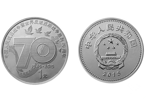 抗日战争70周年纪念币,有金币和银币,金币面额为100元,银币面额为50元。金银币的正面是国徽图案、国名和年号。金币的背面是以延安塔和绵延的延安河水为背景,一个八路军战士手持号角做吹号状,体现了八路军战士的光辉形象,在右侧有“70”的字样,在下方标有“1945-2015”的标志。银币的背面是以长城为背景,社会各阶层各职业的抗日人民站在长城前,体现了举国上下、众志成城、团结一心,脚下是波涛汹涌的浪花。金银币的构图十分完整,喷砂效果出众。