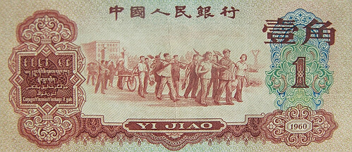 枣红一角人民币的大小还没有一个巴掌大。该人民币有央行发行。它的主要色调就是枣红色。它的正面图案最中间是一群人有的推着单轮车,有的扛着锄头,在领导的带领下努力劳作,建设社会主义的场景。该图说明了当时国家主要以种植为主要经济来源。