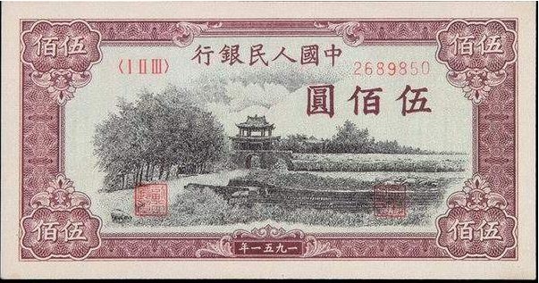 伍佰圆“是第一套人民币“绝品四珍”中币值最小的,相当于第二套人民币的5分钱。若按增值率计算,伍佰圆“瞻德城”是“绝品四珍”中最高的,达到500万倍,仅次邮票收藏听“蓝军邮”。“瞻德城”如果市场有成交,最低价也在35万元以上,而且有价无市,特别难求。