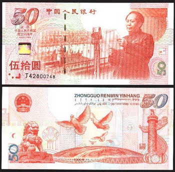 建国50周年纪念钞50元以庆祝我国建国50周年为题材,它的发行数量足有6000万张,但还是满足不了全国民众的收藏热情,在发行初期它的价格还没有比较好的表现,但是它的价值经过人们的挖掘不断升高,现在市场价已经达到了400元上下,成为收藏爱好者们所喜爱的珍品,经过专家的推测,它的升值空间还没有消失,在未来还会有惊人的涨势,我国发行的红色题材纪念钞仅此一种,也在很大程度上助涨了它的升值态势。