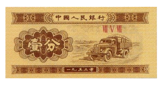 1953年1分纸币一共有两类,一类是50年代初期印刷发行的1分原版,正面除了印有3位的罗马数字外,还有着7位数的阿拉伯数字冠码。不过这个原版已经很少见,存世量很少,所以它的收藏价值很高,目前在人民币收藏市场上也可以卖到四五百元一张。