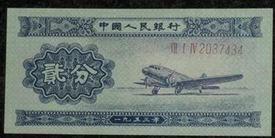 1953年2分就是第二套人民币中的一个小成员,这张纸币发行于1955年。纸币的正面是一架正在起飞的飞机,飞机起飞的背景色采用了蓝色。纸币的背 面是国徽以及汉蒙、维、藏等少数民族的文字并加以花符衬托。因为当时的技术还不够先进,所以1953年纸币是没有水印的。