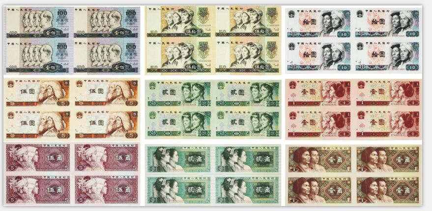 中国人民银行于2002年发行了长城四连体钞大全套,这款四连体钞共有1角至100元九种面值组合而成,俗称“长城大四连”。而在2001年发行了长城八连体钞,一共有七种不同面值的纸币组成。就拿这款四连体钞大全套来说,票面整体图景大多以人物头像为主,其中有革命领袖,工人农民,以及少数民族等。票面背面主体背景大那都是我国的名胜古迹,着名景点等。