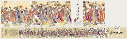 《八十七神仙卷》由唐代著名画家吴道子创作,场面之宏大,人物比例结构之精确,神情之华妙,构图之宏伟壮丽,线条之圆润劲健,是我国美术史上罕见的经典传世之作,是艺术史上的一个伟大奇迹。 | |