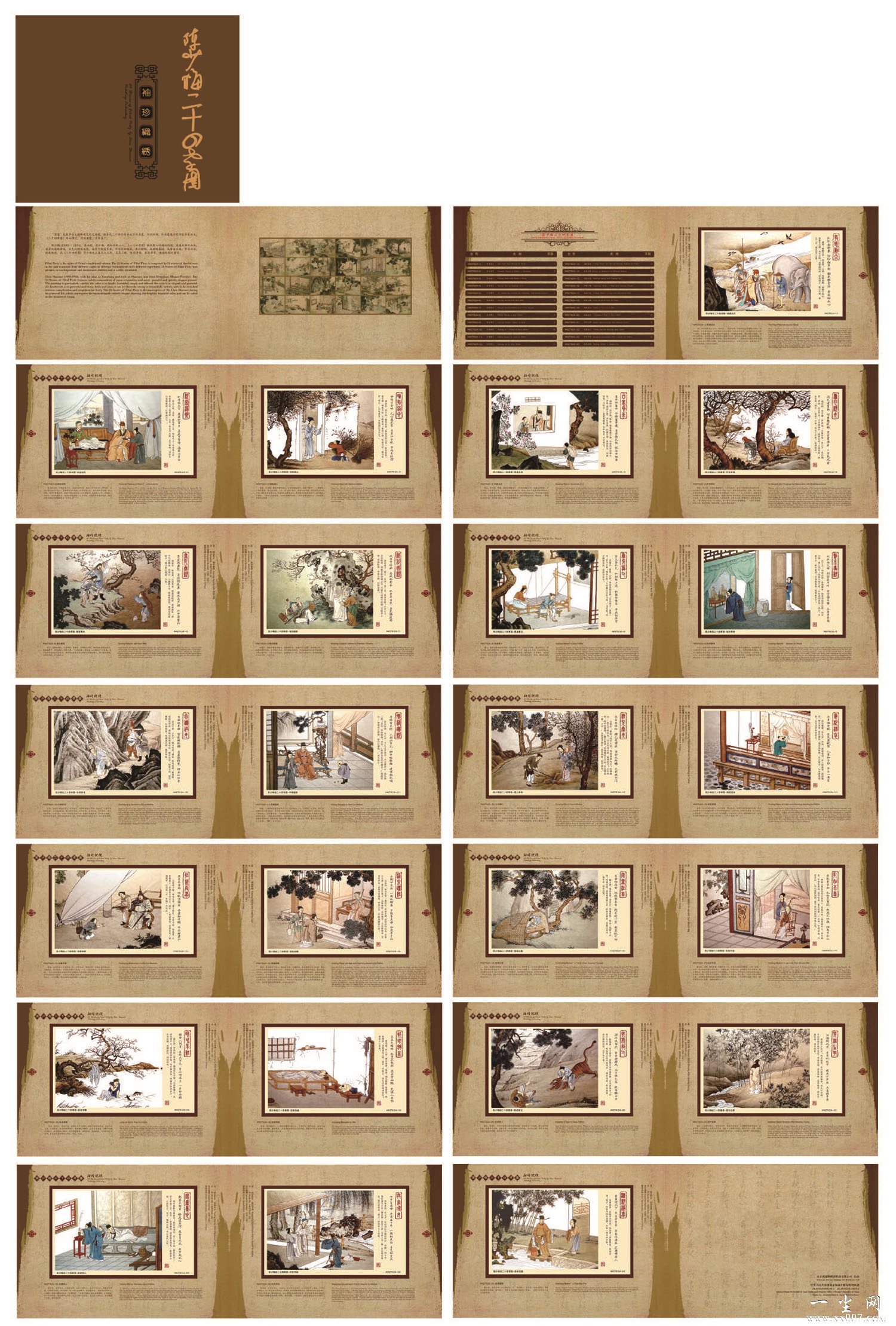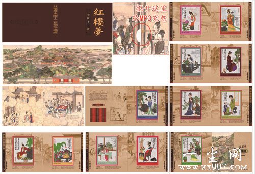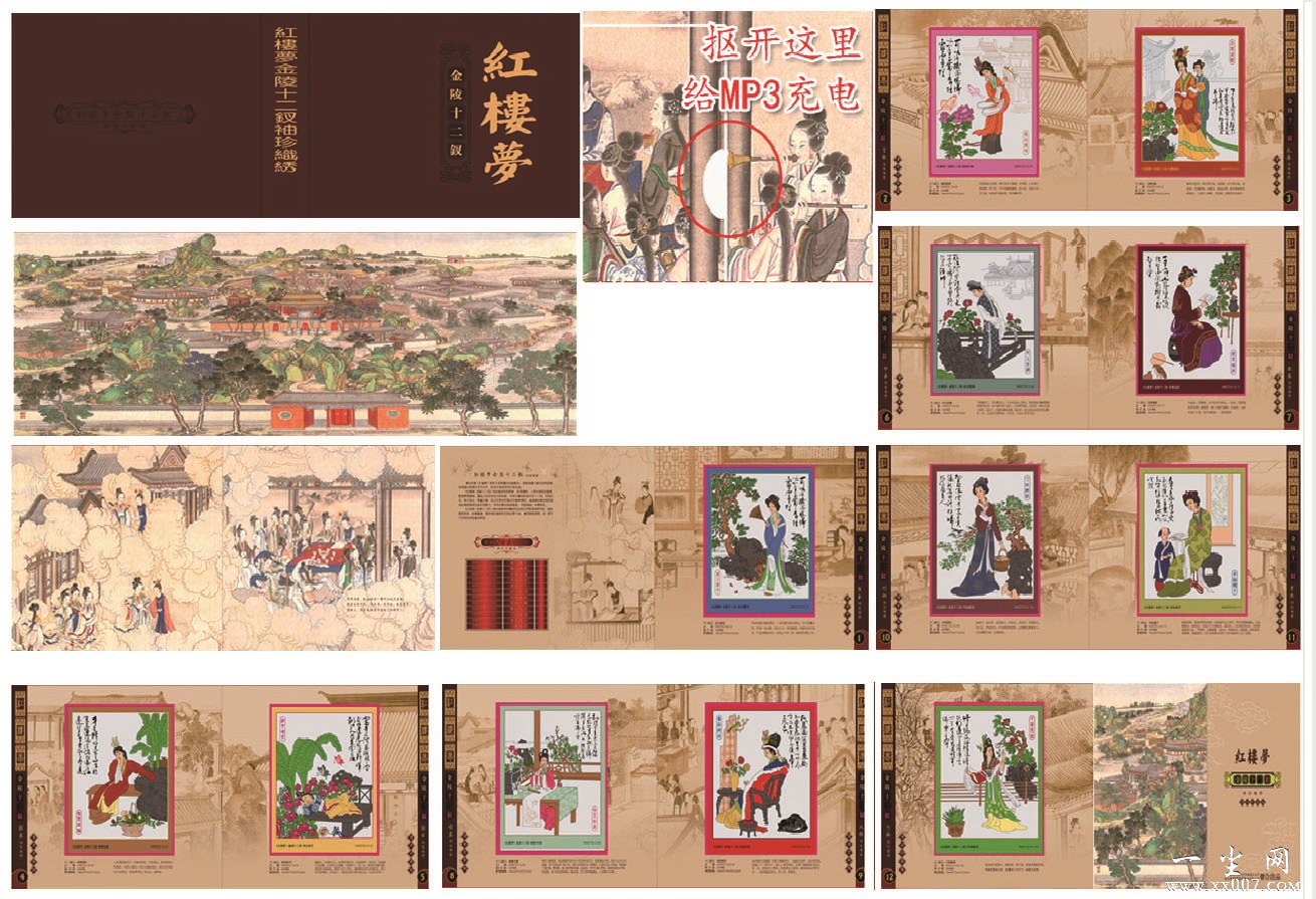 《红楼梦-金陵十二钗》袖珍织绣布局得当、意境清新,人物神态贴切逼真、服饰华贵艳丽,画面上身世地位大相径庭、性格志趣迥然相异的十二钗,栩栩如生,呼之欲出。亭台水榭、假山花草着色简淡又备见精巧,处处让收藏者感受到袖珍织绣艺术的风采和魅力。其判词书法劲峭飘逸,笔势洒脱,风华自足。 | |
