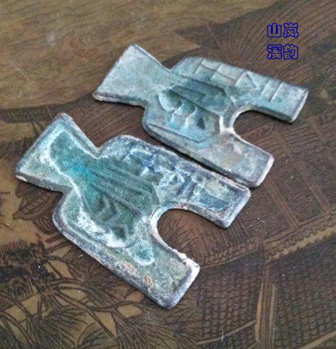 左稍大者,钱体较薄,高:60mm;脚宽:38mm;重:17.4克。