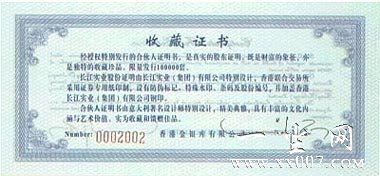 ![]() 长江实业一股实物股票正面 ![]() 收藏证书正面 ![]() 长江实业实物股票“合伙人”收藏册封面 新浪财经讯 在香港H股上市的长江实业股票,突然在中国市场出现了其“真正的股票”。该股票并不是通常意义上的一个概念,而是由香港证券联合交易所印制的一股实物股票,并打破了无单股出售的记录。 经证实,长江实业这股实物“股票”,并没有直接以股票的形式出现,而是由香港金