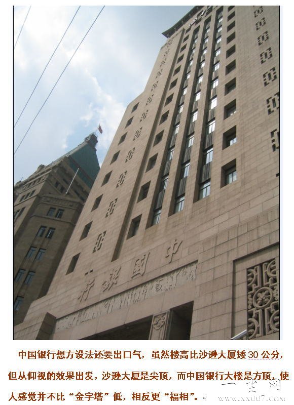 位于上海中山东一路23号的中国银行大楼至今已默默地走过了72个春秋,它是外滩众多建筑中唯一一幢由中国人自己出资、自己建造的大楼。它的东部塔楼由17层,采用方型尖顶,每层的两侧有镂空图案,其栏杆和窗格等都富有中国民族特色的设计元素。门前石阶共有九级,象征九九归一;走进大厅,天花板两侧又雕有“八仙过海”的图案,取神通广大之意;大厅上方饰有孔子周游各国的石雕,每层的两侧外墙都有镂空的“寿”字图案,显示出一种祥和与雍容的气度。它以艺术装饰主义的摩天楼之身,扣上蓝色琉璃瓦的中国传统四角攒尖顶,在外滩建筑群中独树一帜。中国银行原先在汉口路外滩(今上海市总工会大楼西侧),1937年才迁到中山东一路23号.说起它的新楼改建还有一段故事呢!