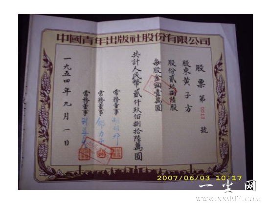 50多年过去了,这张中国青年出版社股份有限公司的股票记录这一历史事件, 胡耀邦/邵力子/刘导生三位历史名人的手迹和私印跃然纸上,而股东黄子方先生,是我国著名的教育家,既是文坛巨匠___巴金先生的好友,又是音乐大师___聂耳先生的至交.