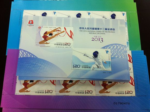 十二运会纪念邮票发行于2013年8月下旬由着名邮票设计家王虎鸣设计,与以往历届全运会邮票多以吉祥物、会徽作为邮票的主角不同,十二运邮票是两个不同的运动项目作为邮票创作的主要设计元素,而会徽和吉祥物在这次的设计中只是作为设计元素放在邮票画面中,其中一牧邮票设计的是一名女艺术体操运动员的腾空动作,另一枚邮票则选用的是一名男击剑选手进攻的瞬间。