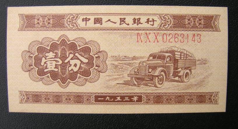 五三年的一分纸币有两个版本,最先发行的是1953年的版本,这张纸币的颜色是红色,主要图案是一个卡车,一分二字为繁体字,除了有年份等必要的票面标识之外,1953年一分钱人民币最大的特点在于它有阿拉伯数字,这就是1953年的人民币第一版,由于发行时间很短所以现存的人民币数量非常少,所以1953年一分的纸币值多少钱比其他的一分纸币要高出很多,一张现在的收藏价格为几百元。