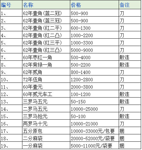 第三套人民币价格表,行情变换快,以下价格仅供参考,最新价格以电话为准