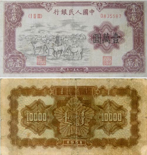 第一套人民币进入人民币收藏领域是二十世纪八十年代后的事,到今天只有二十多年的时间,在这二十多年内,第一套人民币从“弃至于地无人问津”,到今天“洛阳纸贵”。价格一路飚升、货源日益减少、收藏队伍越来越大,拍卖场上屡创新高。由于不少是珍品,其观赏、纪念、珍藏、投资价值与日俱增,受到知名拍卖行和文物收藏家的特别青睐,第一套人民币中一万元面额,有牧马图(有蒙文)和骆驼图(有维文)两款。其中,1951年5月17日发行的一万元牧马图案币(有蒙文),在1997年一次文物拍卖会上,出价高达5万元。业内人士分析,建国初期第一套人民币有其独特身价,其中的珍藏精品价值还会走高,将来开出天价都是不足为奇的。