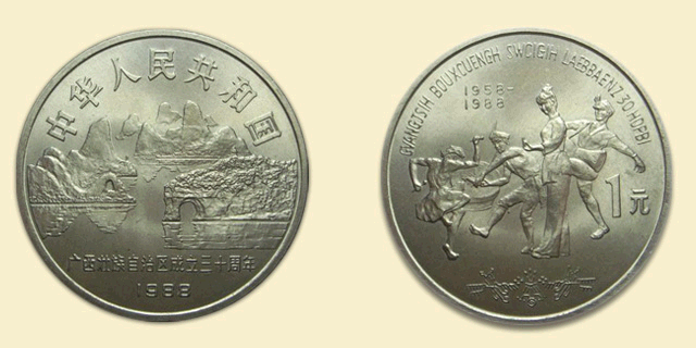 广西壮族自治区成立30周年纪念币由沈阳造币厂铸造,在1988年2月1日发行,选择铜镍合金为主要材质。重量为9.32克,直径为30毫米,面值为1元的硬币,最大发行量达到了406.8万枚。硬币正面为“桂林山水甲天下”的秀丽风光,印有“广西壮族自治区成立30周年”、“中华人民共和国”、“1988”等字样。背面是广西壮族人民在欢庆节日时与各族人民载歌载舞热闹景象,在图案上方是用英语写的“广西壮族自治区成立30周年”、“1958-1988”字样,下方是花篮图案及“1元”字样。