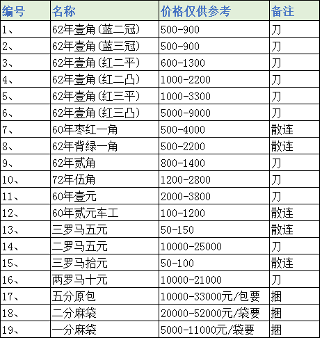 第三套人民币价格表(行情变换快,以下价格仅供参考,最新价格以电话为准):