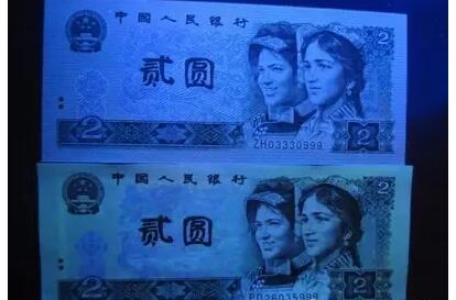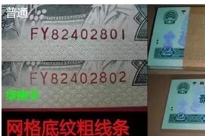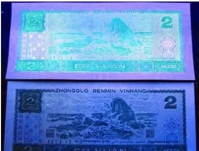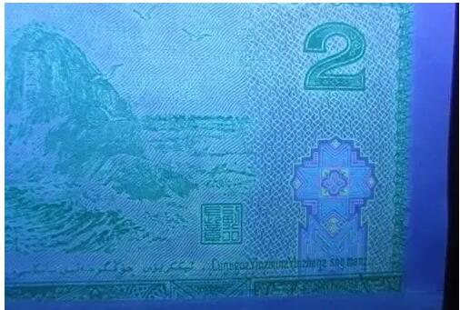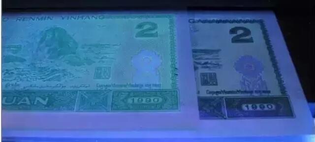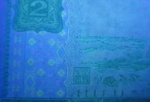 其实只要在荧光灯下对比,就很容易看出,2元券背面的“绿幽灵”相对其它钞票来说,荧光效果非常突出,无论是网格、底纹、花卉、还是数字,都有明显的荧光效果。