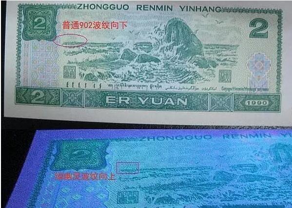 ③ 在其反面也有不易发现的不同,反面右侧的水波纹是向上的,而普通的波纹是向下的。