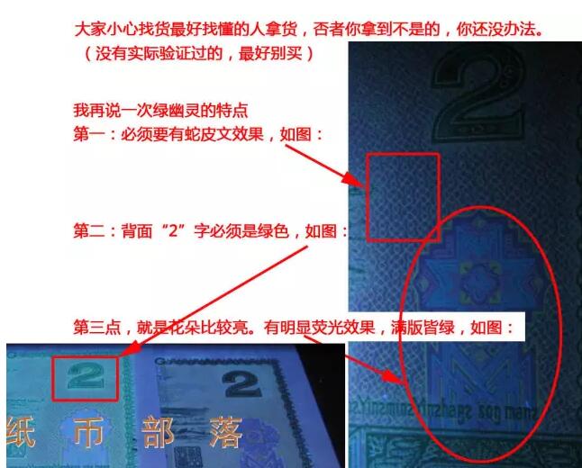 经过一段时间的收集,有研究绿幽灵的人士有了新认识和发现。绿幽灵不仅仅是背绿荧光这么简单,也可以通过肉眼识别出来。无论是纸张,油墨和印刷设备等因素来分析。种种证据证明他就是试验钞。是版别的区别,而非荧光强弱的区别。