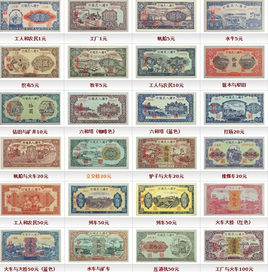 第一、二、三版人民币的升值幅度比较大。比如,第一版人民币全套62张,品相有八成新的话,价格可以卖到500多万元;第二版人民币中,由苏联印制的3元、5元、10元三种钞票稀少,最受藏家欢迎;第三版人民币中,“枣红一毛”、“背绿一毛”两张一角纸币,枣红市价炒到了8000元,背绿水印一角上品50000左右,带有车床工人图案的2元纸币也被炒到了1800元。