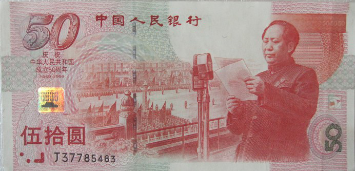 1999年发行的“庆祝中华人民共和国成立50周年”纪念钞,面值50元,发行量6000万,现在市价400多元左右。