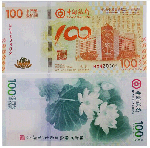 中国银行纪念钞包括香港纪念钞和澳门纪念钞,香港纪念钞的正面是中国银行北京总部的大楼,并搭配了一百年前《申报》关于中国银行成立的报道。正面的中央部位是“100”元的面额,将中国书法的韵味展现的淋漓尽致,正好又能够点明主题。后面是以维多利亚港作为风景,让更多人看到中银香港为香港的繁荣发展做出的卓越贡献。票面以红色作为主要色调,显现出了百年庆典的喜庆和祥和的氛围。背面是香港中银大厦以及维多利亚港的风景,采用金紫荆雕塑作为主要图案,看起来特别美观大气。