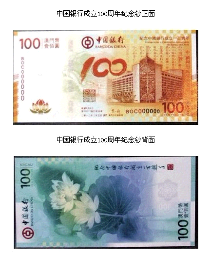 2012年正值中国银行在大清银行的基础上改造成立100周年。为了庆祝中国银行成立百周年,我国的中国银行于2012年2月6日发行了纪念100周年的纪念币、纪念钞以及邮票。而中行本身因为在香港和澳门具有当地货币的发钞权,因此中国银行在得到两个特区的金融部门许可的情况下,分别于香港和澳门发行面额均为100的中国银行百年纪念钞。