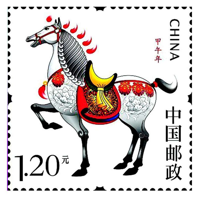 《甲午年》特种邮票1套1枚,面值1.20元,该套《甲午年》生肖邮票马的设计造型汲取了中国古代马雕塑的精髓,白马面颊俊秀、筋骨雄强、体态 优雅、气宇轩昂,装饰在马身上的牡丹、蝙蝠,表达了“马上得福”、“吉祥富贵”的美好祝愿。邮票印制选用特种银浆油墨,邮票画面上的马随着视角的变换闪烁 着金属光泽。该套邮票由曾设计过2012龙年生肖票等4套生肖票的中国着名平面设计师陈绍华先生创作,由北京邮票厂印制。