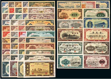 第一套人民痹抖2个品种中,"十二珍品"最受关注,分别为伍圆的"水牛图",贰拾圆的"打场图",伍佰圆的"瞻德城",壹仟圆的"牧马图"、"帆船图",伍仟圆的"牧羊图"、"蒙古包"、"渭河桥",壹万圆的"骆驼队"、"牧马图",伍万圆的"新华门"、"收割机"。其中,壹万圆的"牧马图"、伍仟圆的"蒙古包"、伍佰圆的"瞻德城"和壹万圆的"骆驼队"被誉为"尽品四珍",估计全套全品价格接近百万元。
