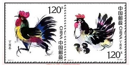 2017年1月5日,中国邮政将发行丁酉年生肖鸡特种邮票,据了解,丁酉年生肖鸡特种邮票共有两枚,第一枚是一只威风凛凛、健美而强壮的雄鸡,以昂首挺胸的姿态走向新的一年;第二枚图案是一只温婉、柔美的鸡妈妈护着两只可爱的小雏鸡。