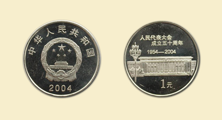 该纪念币正面图案为国徽,内缘上方刊“中华人民共和国”国名,内缘下方刊“2004”年号。背面主景图案为人民大会堂,左侧为人民大会堂前的华灯,内缘上方刊“人民代表大会成立五十周年”、“1954-2004”字样,内缘下方刊面额“1元”。
