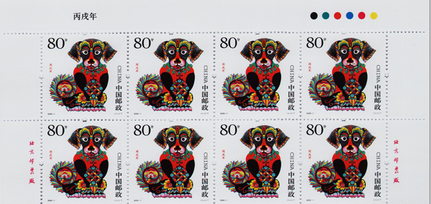 7。令人新奇的是,在邮局全张票边纸上增加了《丙戌年》邮票名称,具体位置在左上角第1号票的上方,此举如同小版张边纸上的票名,实有画龙点睛之妙,并使邮局全张票更加规范。
