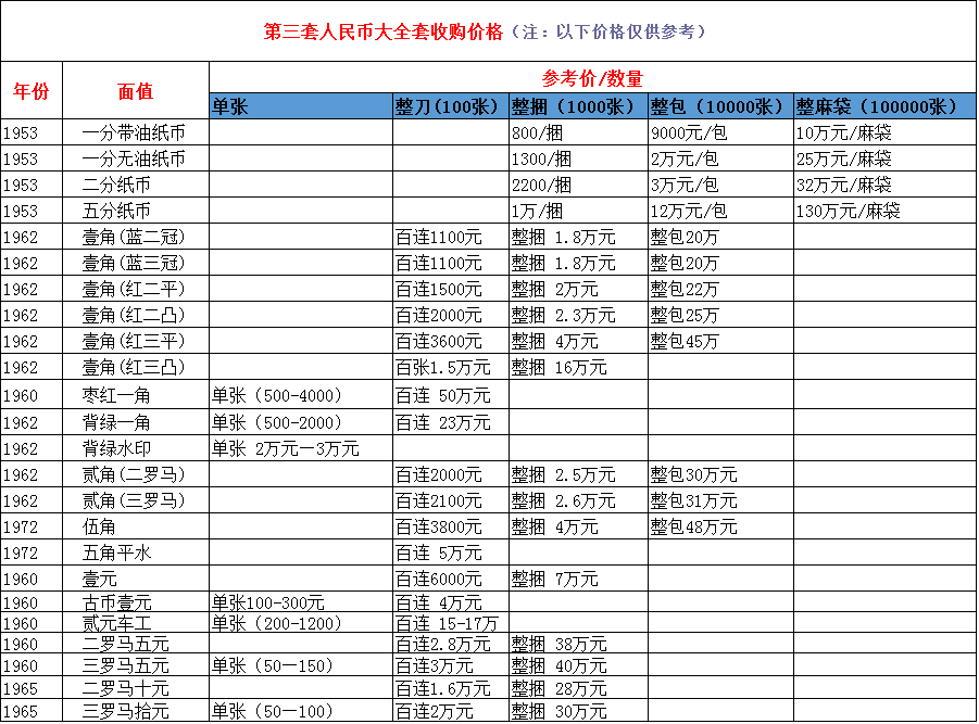 第三套人民币大全套收购价格