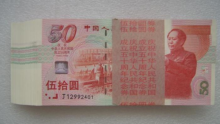 为隆重庆祝中华人民共和国成立50周年,中国人民银行决定于1999年9月20日发行建国50周年纪念钞三连体,这是我国发行的第一套连体钞,也是第一套纪念钞连体钞。纪念钞正面再现了开国大典的盛况,背面主景为地球、和平鸽、铜狮、华表等组合图,左上方为中华人民共和国国徽,右上方为汉语拼音字母和以蒙、藏、维、壮四种少数民族文字书写的中国人民银行行名和面值。由于其发行量较少,一经发行就受到人们的喜爱,被列入收藏清单。。