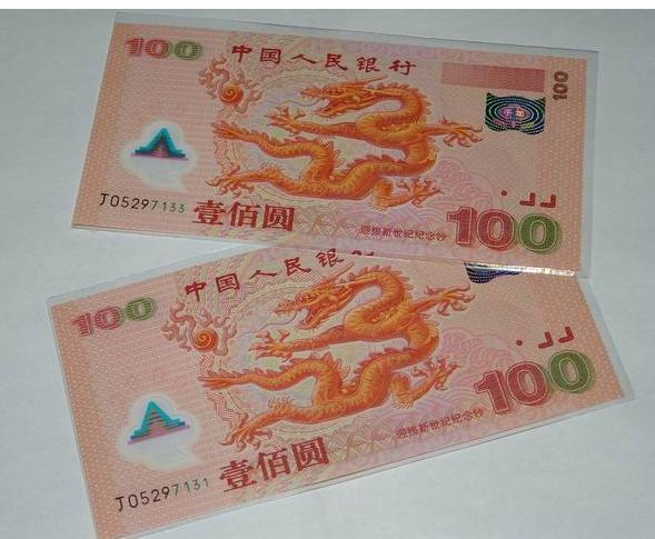 千禧龙纪念钞,是中国人民币银行为迎接新世纪新千年而发行,纪念意义重大。该纪念钞正面以龙作为图案,主要寓意在新的世纪里我们作为炎黄子孙、龙的传人,需要担负起新千年新世纪中国崛起的重大责任,具有很高的纪念收藏价值。龙钞双连体只发行了10万张,发行数量相当少,以至现在市场上出现龙钞双连体的价格一涨再涨,升值接近40倍之多,由此可见,这个本身发行量就不多的龙钞双连体未来潜藏的升值空间。