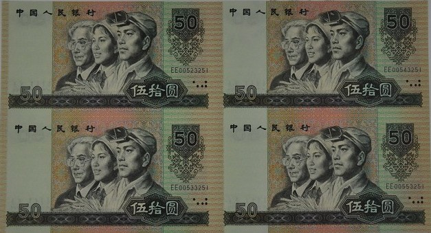 第四套人民币80版50元的主色调为茶黄色,被称为人民币中的“软黄金”。而且因为伴随着第五套人民币2005 年版的投放,第四套人民币进入收藏领域是必然的趋势。从其图片上可看到, 90版50元四连体的正面是工人、农民、知识分子头像,体现了我国宪法规定的“中华人民共和国是工人阶级领导的、以工农联盟为基础的人民民主专政的社会主义国家”和“社会主义的建设事业必须依靠工人、农民和知识分子,团结一切可以团结的力量”的国体和政体性质。其背面主景取材于我国的名山大川:黄河壶口瀑布。背面的黄河是华夏诞生的摇篮,衬托国徽的则是汉族古代纹饰,蕴含着我国丰富的文化艺术。除此之外,钢铁工人头像图案用固定水印,使其立体感强。正面工人、农民和知识分子头像浮雕像,背面“黄河壶口瀑布”主景图案。正面冠字编码、正面底边颜色较深的花边都使用磁性油墨。有金属安全线:迎光透视肉眼即可看到贯穿于票面右侧的钞纸币。其票面票幅规格:160×77mm。