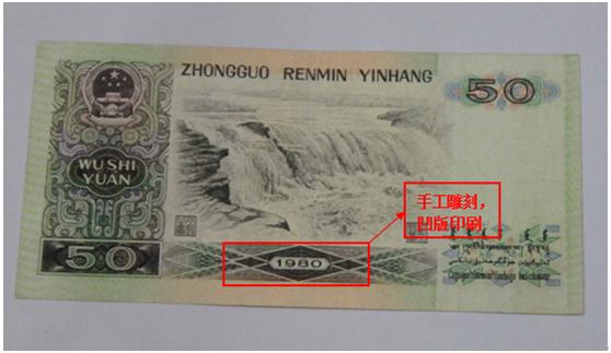 年号是手工雕刻,凹版印刷,用放大镜细看,印刷出的年号油墨呈高浮雕状,且均有毛线条外渗透,数字笔画刻画痕迹明显有网纹,字样及冠字号颜色整体过度均匀。
